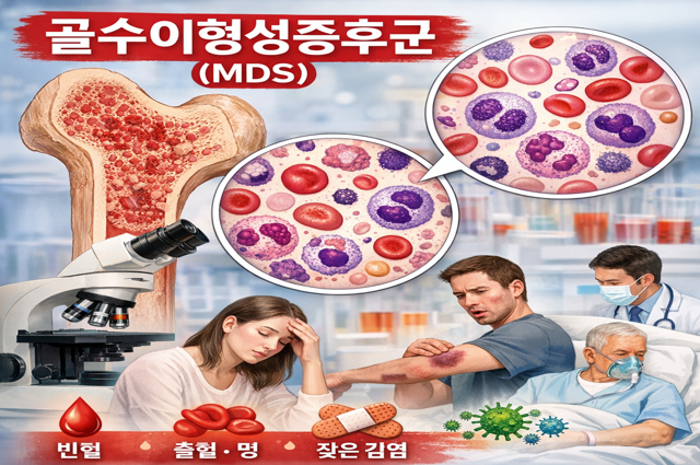 골수이형성증후군은 골수에서 비정상적인 혈액세포가 만들어지면서 적혈구, 백혈구, 혈소판 전반에 영향을 줄 수 있는 혈액질환입니다. 겉으로는 단순한 피로나 빈혈처럼 시작될 수 있지만, 실제로는 감염 위험과 출혈 위험까지 함께 높아질 수 있어 결코 가볍게 볼 수 없습니다.